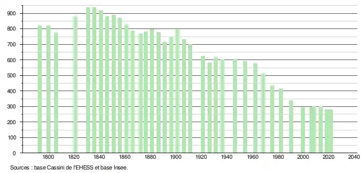 L'évolution du nombre d'habitants est connue à travers les recensements de la population effectués dans la commune depuis 1793. Pour les communes de moins de 10 000 habitants, une enquête de recensement portant sur toute la population est réalisée tous les cinq ans, les populations légales des années intermédiaires étant quant à elles estimées par interpolation ou extrapolation[28]. Pour la commune, le premier recensement exhaustif entrant dans le cadre du nouveau dispositif a été réalisé en 2008[29].
