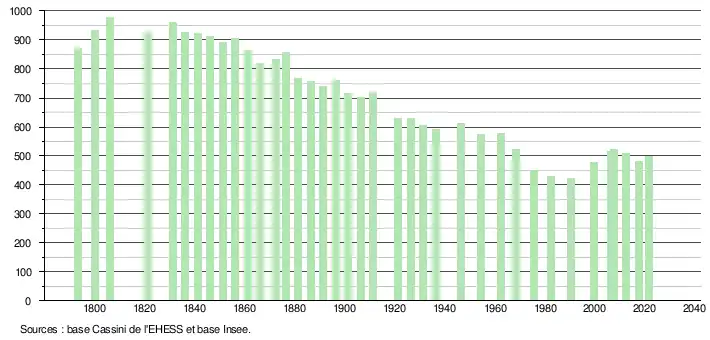 L'évolution du nombre d'habitants est connue à travers les recensements de la population effectués dans la commune depuis 1793. Pour les communes de moins de 10 000 habitants, une enquête de recensement portant sur toute la population est réalisée tous les cinq ans, les populations légales des années intermédiaires étant quant à elles estimées par interpolation ou extrapolation[18]. Pour la commune, le premier recensement exhaustif entrant dans le cadre du nouveau dispositif a été réalisé en 2007[19].