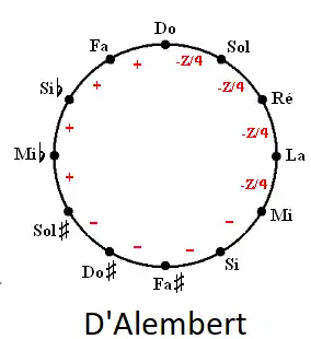 - On obtient ainsi un tempérament polyvalent dont le ton le plus juste eu égard aux tierces est Ré Majeur. Les tons voisins sont excellents. Mais le Sol (en fait La issu de quintes pythagoriciennes) est un peu bas, ce qui altère la cadence en La.