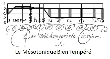 Tempérament à 4 tierces pures. Ce tempérament est considéré à l'époque de Bach par certains auteurs comme la meilleure alternative au tempérament égal. C'est un très bon tempérament, qui à la fois permet la pratique dans toutes les tonalités (mais pas sans colorations « vigoureuses »), et donne de très belles tonalités centrales (doM, solM, réM, voire faM sont les mêmes qu'en mésotonique classique). Il est progressif d'une tonalité à l'autre.