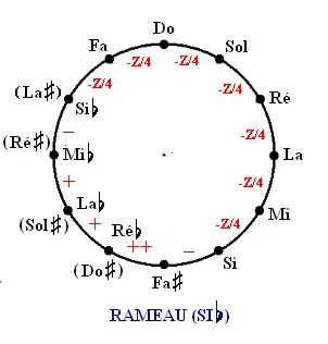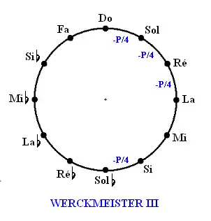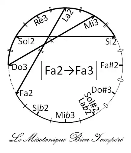 - Les tierces Si-Ré, Fa-La, Do-Mi, Sol-Si, Ré-Fa et La-Do sont bonnes, corrigées de 2/3 de comma et les deux quintes augmentées d'un tiers de comma sont placées de telle façon qu'aucun véritable loup ne se manifeste.