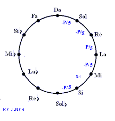 - Le comma pythagoricien est réparti par cinquièmes sur 5 quintes (qui deviennent ainsi un peu courtes) : Do-Sol, Sol-Ré, Ré-La, La-Mi et Si-Sol.