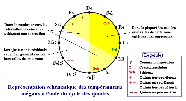 On résume souvent le principe d'un tempérament à l'aide d'un schéma représentant le cycle des quintes, en indiquant pour chacune d'entre elles la correction qui est apportée par rapport à la quinte « juste » pour améliorer les tierces. Ces corrections sont - chez les auteurs les plus rigoureux[Qui ?] - exprimées en fractions de comma. On rappelle qu'il faut au total diminuer l'ensemble du cycle d'un comma pythagoricien (pour obtenir une octave pure) et diminuer un groupe de 4 quintes pures consécutives d'un comma syntonique pour obtenir une tierce majeure pure ... en n'oubliant pas que réduire une quinte, c'est en augmenter au moins une autre !