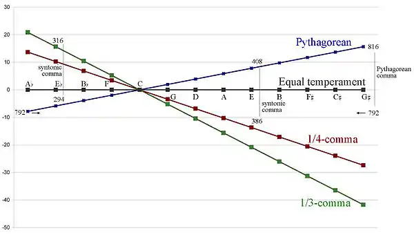 Les notes de la gamme de Pythagore sont obtenues en empilant des quintes pures (de rapport 3/2) : do - sol, sol - ré, ré - la et la - mi, etc. Mais, avec cette construction, la tierce obtenue, do - mi , a un rapport de 81/64, c'est la tierce pythagoricienne. Elle diffère de la tierce pure de rapport 5/4 = 80/64. Afin d'obtenir une tierce pure, il faut donc réduire légèrement les quintes.