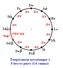 Les tempéraments mésotoniques ont été imaginés pour utiliser des tierces pures, ce qui est possible dans huit tonalités majeures et dans leurs tonalités relatives mineures. Ces tierces majeures, divisées en deux tons égaux, laissent subsister une quinte du loup plus ou moins prononcée ainsi que quatre tierces trop grandes, appartenant à des tonalités interdites.