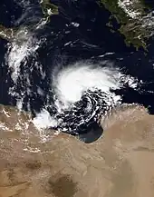 La tempête, après avoir traversé la Méditerranée orientale, touche le nord de la Cyrénaïque en Libye. Les 414 mm de pluie déversés en une journée provoquent de violentes inondations et coulées de boue dans les villes de Derna, Al Marj et la région de Djebel Akhdar. La rupture des barrages de Derna et de Mansour situés sur l'oued Derna entraîne une inondation catastrophique à Derna. Plusieurs quartiers sont inondés, des édifices et des ponts détruits[1],[6],[28].