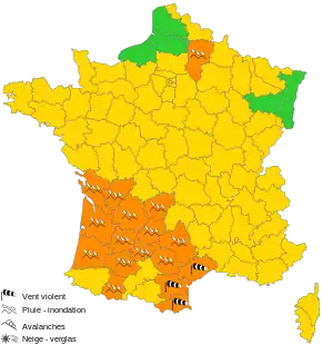 À l'occasion de cette tempête, Météo-France diffuse dès le une carte de vigilance météorologique avec des niveaux d'alerte rouge pour 5 départements du Sud-Ouest[30]. Elle sera mise à jour plusieurs fois dans la journée du .