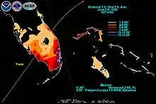 Au Bahamas, les îles les plus au nord nord ont reçu de fortes quantités de pluie avec un maximum de 9,54 pouces (242 mm) à Freeport sur Grand Bahama selon la carte ci-contre.