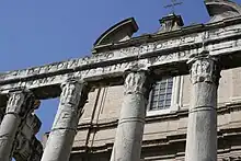 | « [Ce temple a été construit en l'honneur du] divin Antonin et la divine Faustine sur décret du Sénat (S•C pour senatus-consultum). » |