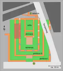 Une fontaine d'origine médiévale se trouve à l'entrée sud du monument (1). De là, on accède par un escalier au péristyle intérieur (porticus II), puis au temenos, espace sacré, qui mène au pronaos, entrée du temple, puis à la cella, espace fermé dédié à la divinité.