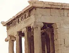 Le temple d'Athéna Nikè a été construit à partir de -432 et inauguré en -421, après la paix de Nicias, d'après les plans de l'architecte Callicrate (mentionné par une inscription antique sur une stèle aujourd'hui au musée de l'Acropole). Ce petit temple est d'ordre ionique, tétrastyle (à quatre colonnes) et amphiprostyle (il comporte une colonnade à l'avant et une autre à l'arrière).