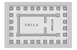Les premières reconstitutions du temple basées sur une observation précise des vestiges donnent un temple de six colonnes en façade et neuf latérales, quasiment pycnostyle, c'est-à-dire que la distance entre les colonnes est équivalente à une fois et demi leur diamètre, sur une crépis de quatre marches. La cella devait être presque deux fois plus longue que large[14]. Les archéologues allemands Brunn et Jordan estiment le diamètre des colonnes à la base entre 1,15 et 1,25 mètre avec un écartement entre l'axe des colonnes de 2,66 mètres. Les colonnes sont donc plus resserrées que dans le plan type du temple pycnostyle tel que définit par Vitruve[15]. Le tambour inférieur du fût rainuré des colonnes est taillé dans le même bloc de marbre du Pentélique que la base constituée d'un unique tore, rappelant l'élément supérieur d'une base ionique[13].