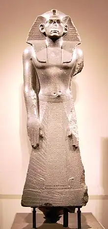- On citera comme exemple de comparaison la statue du roi représenté assis coiffé du khépresh, découverte à Karnak et actuellement conservée au Musée égyptologique de Turin