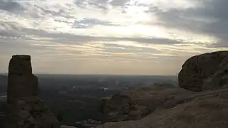 La colline qui s'élève au-dessus de 210 mètres environ de la plaine environnante, a été précédemment appelée Maras ou Marabin, du nom d'un village situé à proximité. C'est par ce dernier nom que le site est nommé des historiens arabes.