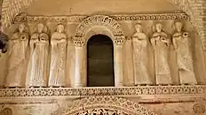 La partie la plus intéressante est cependant la frise du niveau supérieur, librement superposée aux éléments architecturaux du bâtiment tels que les fenêtres. Six figures en relief de Saints, en stuc, sont exceptionnellement bien conservées : leurs figures monumentales sont à rapprocher des modèles classiques, réinterprétés selon la culture lombarde. Les drapés des robes richement décorées ont un motif rectiligne accentué, rappelant les modèles byzantins[1], dont les Saints se distinguent cependant par le plus grand sens du volume et par le verticalité, encore marqué par la longueur des plis des tuniques[6].