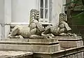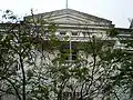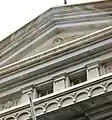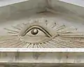 La façade a une forte inspiration égyptienne, à chapiteaux avec des feuilles de palmier tenant un grand fronton triangulaire. Au fronton, un œil avec des rayons radiants, au pied de chaque colonne siègent deux sphinx (quatre au total). La porte d'entrée est sculptée en bois avec des motifs géométriques, au-dessus, le linteau est décoré avec des feuilles de palmiers et un soleil avec les ailes d'un aigle, symbole de Horus[2].