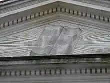 Sur le fronton est sculptée une Bible ouverte, symbole habituel des temples réformés qui encouragent à sa lecture en français à une époque où l'Église catholique en interdit l'accès à ses fidèles. Elle repose sur un bas-relief représentant des rayons de lumière. Sur ses pages sont gravées une citation de l'Évangile selon Matthieu 24, 35 « Le ciel et la terre passeront / mais mes paroles ne passeront point ».