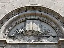 Sur le tympan en plein cintre figure la Bible, reposant sur des palmes et une frise grecque, avec sur la page de gauche « Sainte Bible » et sur la page de droite « La parole du Seigneur demeure éternellement. St Pierre 1 x 25 »
