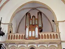 Le chœur est fermé dans sa partie supérieure par une balustrade en pierre finement ajourée qui détermine une tribune destinée aux orgues. Sous les orgues se trouve la table de communion, la chaire, munie d'une belle rampe de fer forgé aux rinceaux délicats, est rejetée vers la gauche, les fonts baptismaux vers la droite[3].