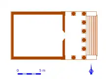 Le temple est établi sur un podium monté en blocs de grand appareil. Ce podium, plus long que la cella vers l'est, ménage à l'avant de celle-ci un espace libre qui permet l'installation d'une colonnade de façade selon les principes énoncés par Vitruve dans De architectura, même si cet auteur préconise une orientation vers l'ouest[9].