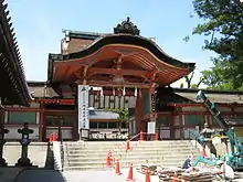 - Rōmon (楼門) : une porte élevée à un étage dont seul l'un dispose d'un espace utile, entourée d'un balcon et surmontée d'un toit[23]. Bouddhiste d'origine, elle est également utilisée dans les sanctuaires shinto[24].