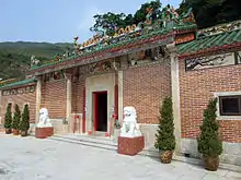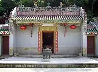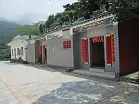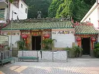 Temple de Tin Hau de Sha Lo Wan (沙螺灣天后宮) Construit en 1919. Situé à gauche du temple Ba Kong, dédié à Hung Shing. Un mur relie les deux temples sur la façade[17]. (Vu de face, le temple de Tin Hau se trouve à droite). |