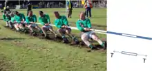 Combinaison d'une photo d'une équipe de tir à la corde avec une illustration dessinée des éléments de la corde et un diagramme de corps libre d'un élément représentant la tension mécanique exercée par les deux équipes.