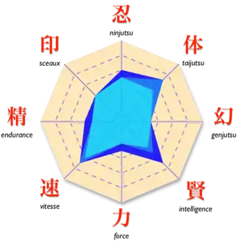 | Milieu Partie II[DB 3] | 51 % | 17 ans | Chūnin (中忍) | 164 cm | 47,3 kg |