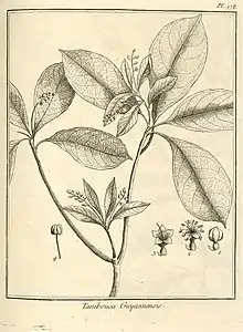 LE TANIBOUCIER de la Guiane. (Plance 178.)Le tronc de cet arbre s'élève a vingt pieds & plus, ſur environ deux pieds de diamètre. Son écorce eſt cendrée ; ſon bois eſt blanchâtre, caſſant & peu compacte. Il pouſſe à ſon ſommet des branches droites, & d'autres horiſontales qui ſe répandent en tous ſens. Ces branches ſont chargées de rameaux tortueux, garnis à leur ſommet de feuilles alternes, liſſes, fermés, entières, ovales, terminées en pointe. Leur pédicule eſt long d'un pouce, convexe en deſſous, & creuſé en gouttiere en deſſus. Les plus grandes ont ſept pouces de longueur, ſur trois de largeur à l'extrémité des rameaux; & a l'aiſſelle des feuilles naiſſent des épis de fleurs longs de trois ou quatre pouces. Ces fleurs ſont ſeſſiles & alternes.