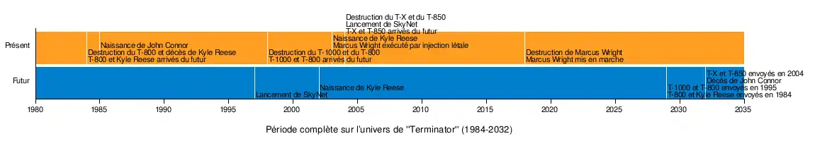 La chronologie est remise en cause par le 6e film, Terminator: Dark Fate, dont l'intrigue se déroule juste après le second film et ignore ainsi celles de Terminator 3 : Le Soulèvement des machines et Terminator Renaissance.