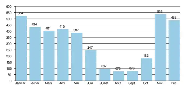 Le débit instantané maximal enregistré a été de 16 m3/s le , tandis que la valeur journalière maximale était de 11,1 m3/s le même jour. La hauteur maximale instantanée est de 170 cm ou encore 1,70 m le [2]. Si l'on compare la première de ces valeurs à l'échelle des QIX de la rivière, on constate que cette crue était d'ordre vicennal, et donc nullement exceptionnelle.