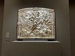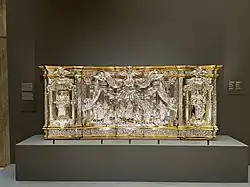 - La section du « Trésor du Saint Sépulcre » exposera des dons offerts à la Custodie de Terre Sainte par de nombreux souverains catholiques au fil des siècles. Ce patrimoine unique comporte des pièces d’orfèvrerie, de paramentique[17] et du mobilier destinés à un usage liturgique ou à l’ornement d’espaces consacrés offerts par des dirigeants tel que Philippe II d'Espagne, Louis XIV de France, Jean V de Portugal, Charles VII de Naples et Marie-Thérèse d'Autriche[14].