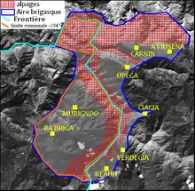Ayant émigré au cours du Moyen Âge et de l'époque moderne des deux côtés de la chaîne alpine du Sciacarée (Mont Saccarel/Monte Saccarello) afin de contrôler un espace d'alpages suffisamment étendu dans l'intérêt de la production et du commerce de la laine, les Brigasques marquèrent et assimilèrent les territoires des actuels hameaux de Murignoo (fr : Morignole), Reaud (it : Realdo), Burnighe (it : Bornighe), Vërdegia (it : Verdeggia), ra Ciagia (it : Piaggia), ra Viuséna (Viozena), Carnin (it : Carnino), Üpega (it : Upega) établis sur un finage utile d'environ 20km².