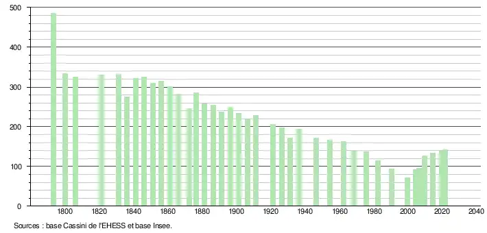 L'évolution du nombre d'habitants est connue à travers les recensements de la population effectués dans la commune depuis 1793. Pour les communes de moins de 10 000 habitants, une enquête de recensement portant sur toute la population est réalisée tous les cinq ans, les populations légales des années intermédiaires étant quant à elles estimées par interpolation ou extrapolation[16]. Pour la commune, le premier recensement exhaustif entrant dans le cadre du nouveau dispositif a été réalisé en 2004[17].