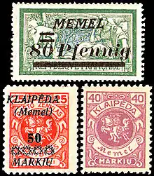 Progressivement, les timbres-poste allemand du type Germania sont remplacés par des timbres français des types Semeuse et Merson, portant des surcharges MEMEL, remplaçant « République française » rayé et la nouvelle valeur faciale exprimée en mark ou en pfennig. Soixante-neuf bureaux de poste sont ouverts et cent-dix timbres français surchargés émis pendant les trois ans d'administration française, ce nombre important s'expliquant par les incessants changements de tarifs[1].