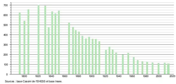 L'évolution du nombre d'habitants est connue à travers les recensements de la population effectués dans la commune depuis 1793. À partir du , les populations légales des communes sont publiées annuellement dans le cadre d'un recensement qui repose désormais sur une collecte d'information annuelle, concernant successivement tous les territoires communaux au cours d'une période de cinq ans. Pour les communes de moins de 10 000 habitants, une enquête de recensement portant sur toute la population est réalisée tous les cinq ans, les populations légales des années intermédiaires étant quant à elles estimées par interpolation ou extrapolation[3]. Pour la commune, le premier recensement exhaustif entrant dans le cadre du nouveau dispositif a été réalisé en 2008[4],[Note 1].