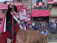 Tous les gonfalons comportant les armoiries de Sienne blanche et noire (la balzana) en haut à gauche en écusson, et l'emblème du Peuple de Sienne (un lion d'argent couronné sur fond rouge) en écusson à droite.