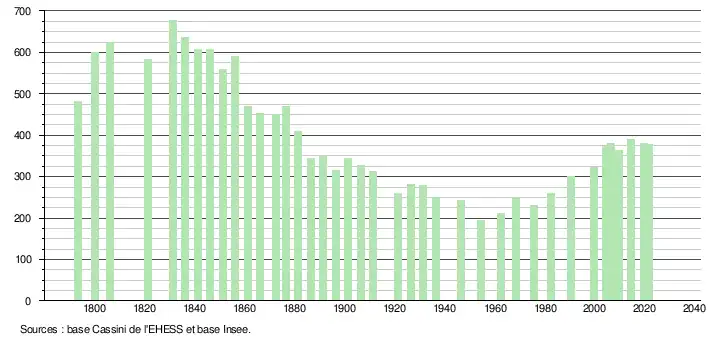 L'évolution du nombre d'habitants est connue à travers les recensements de la population effectués dans la commune depuis 1793. Pour les communes de moins de 10 000 habitants, une enquête de recensement portant sur toute la population est réalisée tous les cinq ans, les populations légales des années intermédiaires étant quant à elles estimées par interpolation ou extrapolation[21]. Pour la commune, le premier recensement exhaustif entrant dans le cadre du nouveau dispositif a été réalisé en 2004[22].