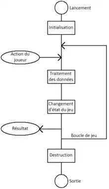 On sait qu'un tour de boucle change atomiquement l'état du jeu. Au lancement, la boucle est démarrée et attend en entrée l'intervention du joueur. À chaque action de l'utilisateur, les données sont traitées, l'état du jeu est modifié et le résultat est renvoyé au joueur. Lorsque la phase de jeu est terminée, la boucle est détruite.