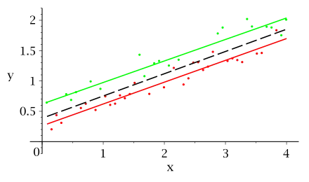 On a deux modèles (rouge et vert) comparés sur un même graphique ; séparer la régression donne de meilleures estimations qu'une estimation globale (droite noire) |