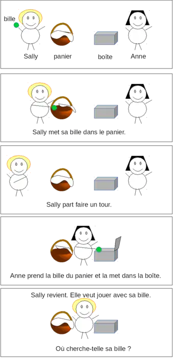 - (en) Cet article est partiellement ou en totalité issu de l’article de Wikipédia en anglais intitulé « Sally–Anne test » (voir la liste des auteurs).