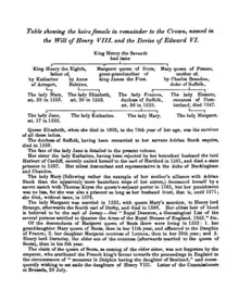 Henri VIII fit une dernière révision de ses dernières volontés et testament le . Il a été signé à l'aide du « timbre sec », un dispositif utilisé depuis 1545 et sous le contrôle d'Anthony Denny et John Gates. Il a confirmé la ligne de succession comme un mâle vivant et six femelles vivantes. Cela a commencé par : Édouard, Marie, Élisabeth. Puis les trois filles de Frances Grey, duchesse de Suffolk, qui était le deuxième enfant et la fille aînée de la sœur cadette d'Henri VIII, la princesse Marie : Jeanne, Catherine, et Marie. Enfin la fille d'Eleanor Clifford, comtesse de Cumberland, qui était la fille de la sœur cadette du roi, Marie Tudor, reine de France, et la petite-fille d'Henri VII d'Angleterre et d'Élisabeth d'York : Margaret[1],[2].