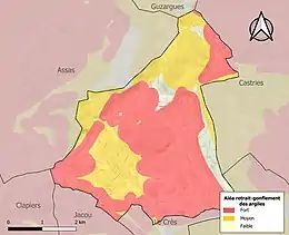 Le retrait-gonflement des sols argileux est susceptible d'engendrer des dommages importants aux bâtiments en cas d’alternance de périodes de sécheresse et de pluie. 93,6 % de la superficie communale est en aléa moyen ou fort (59,3 % au niveau départemental et 48,5 % au niveau national). Sur les 1 739 bâtiments dénombrés sur la commune en 2019, 1 685 sont en aléa moyen ou fort, soit 97 %, à comparer aux 85 % au niveau départemental et 54 % au niveau national. Une cartographie de l'exposition du territoire national au retrait gonflement des sols argileux est disponible sur le site du BRGM[22],[Carte 2].
