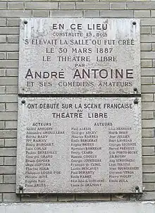 En 1887, le Théâtre-Libre s'installa dans la salle des Menus-Plaisirs, dans le 10e arrondissement, la propriétaire des murs ayant enfin offert des conditions acceptables à André Antoine. Mais en 1894, le directeur du théâtre, en période de difficulté, ayant cédé à l'un de ses comédiens, Antoine Larochelle, le nom Théâtre-Libre, il dut rouvrir ses portes sous un autre nom. Ce sera le théâtre Antoine où l'activité du Théâtre-Libre se poursuivit avec des auteurs tels que Courteline, Tolstoï, Balzac[2], Giovanni Verga, Ivan Tourgueniev, et où furent jouées des œuvres inédites d'écrivains tels que les frères Goncourt, Paul Claudel et Villiers de L'Isle Adam. Dans ses premières années d'activité, le Théâtre-Libre présenta un très grand nombre d'œuvres inédites ou composées par de jeunes auteurs dramatiques, bien plus que la Comédie-Française et le Théâtre de l'Odéon réunis. On peut citer encore Jules Lemaître, Jules Renard, Anatole France et Marie Lenéru (presqu'aveugle, atteinte de surdité dès l'âge de quinze ans), qui produisit son Journal et un essai sur Saint-Just. Parmi les acteurs se trouvait Lucien Guitry[3].