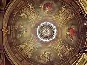 C'est au centre de la coupole qu’est suspendu le grand lustre éclairant la salle, relié à un treuil situé dans les combles qui permettait de le faire descendre pour remplacer ses chandelles[27].