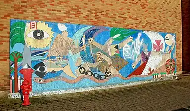 Contre la façade méridionale de l'édifice, le long de la rue du Sablon, est posée une dalle de béton dont les surfaces de « béton brut » sont ornées d'une fresque de 8 m de long intitulée Cyclone des races et réalisée par le peintre cubain Francisco Rivero, né en 1951[16],[17],[18].