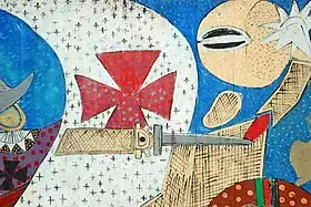 Le « béton brut », plus visible sur cette fresque que sur l'autre, est peint en bleu et parsemé d'étoiles à huit branches.