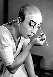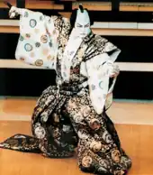 Le jeu des acteurs de kabuki se caractérise essentiellement par les manières et les poses. Il existe deux principales manières, c’est-à-dire deux façons de jouer : aragoto (manière forte) et wagoto (manière douce)[205]. Le jeu aragoto fait appel à des paroles et des gestes exagérés et impétueux, adaptés aux rôles de guerriers ; Ichikawa Danjūrō I est l’inventeur de cette manière qu’il jouait avec un maquillage frappant[206]. Le wagoto, popularisé par Tōjūrō, privilégie au contraire le réalisme du jeu de l’acteur, notamment dans les tragédies bourgeoises[207]. Il faut aussi ajouter l’art de l’onnagata, ces personnages féminins joués avec le plus grand réalisme par des acteurs travestis. Un autre aspect typique du kabuki réside dans les poses exagérées (mie) ou élégantes (kimari) que prennent les acteurs pour exprimer une émotion intense, qui doit stupéfier l’assistance et marquer un sommet de la représentation[208]. Le dialogue demeure souvent pauvre dans le kabuki, étant cantonné à la description des situations et des sentiments, car le jeu stylisé des acteurs, seul à même de transcrire l’« extrême tension psychologique » des confrontations entre personnages, prime résolument[209].