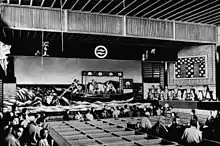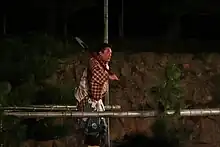 La scène de kabuki comprend une projection complète qui traverse le parterre du public jusqu’à l’arrière-salle nommée hanamichi (花道, littéralement « le chemin des fleurs »), utilisée pour les entrées et les sorties les plus spectaculaires, ainsi que les poses (mie) des vedettes[213],[214]. La révélation d’une identité secrète ou la transformation d’un personnage constituant un point crucial d’une grande partie des pièces du répertoire[215], les moyens de faire apparaître ou disparaître rapidement un acteur se sont multipliés à partir du XVIIIe siècle, sous la forme de dispositifs scéniques variés, comme des trappes (seri) ou des plateaux permettant de faire pivoter tout ou partie de la scène[216].