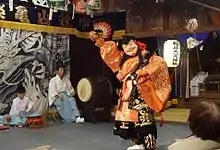Le théâtre japonais trouve ses origines dans les danses rituelles et la chorégraphie sacrée. L’entrée de ces danses dans le folklore s’effectue par la perte progressive de leur sens religieux au profit de plus d’esthétique et de raffinement, notamment à l’instigation de la cour impériale à partir du VIIIe siècle, ainsi que leur représentation dans le monde profane pour le divertissement des hommes et non plus seulement des dieux[1]. Ce processus de folklorisation de tout un ensemble hétérogène de danses, farces et pantomimes aboutit à la naissance à partir du XIVe siècle d’une forme de théâtre élaboré purement japonais[2].